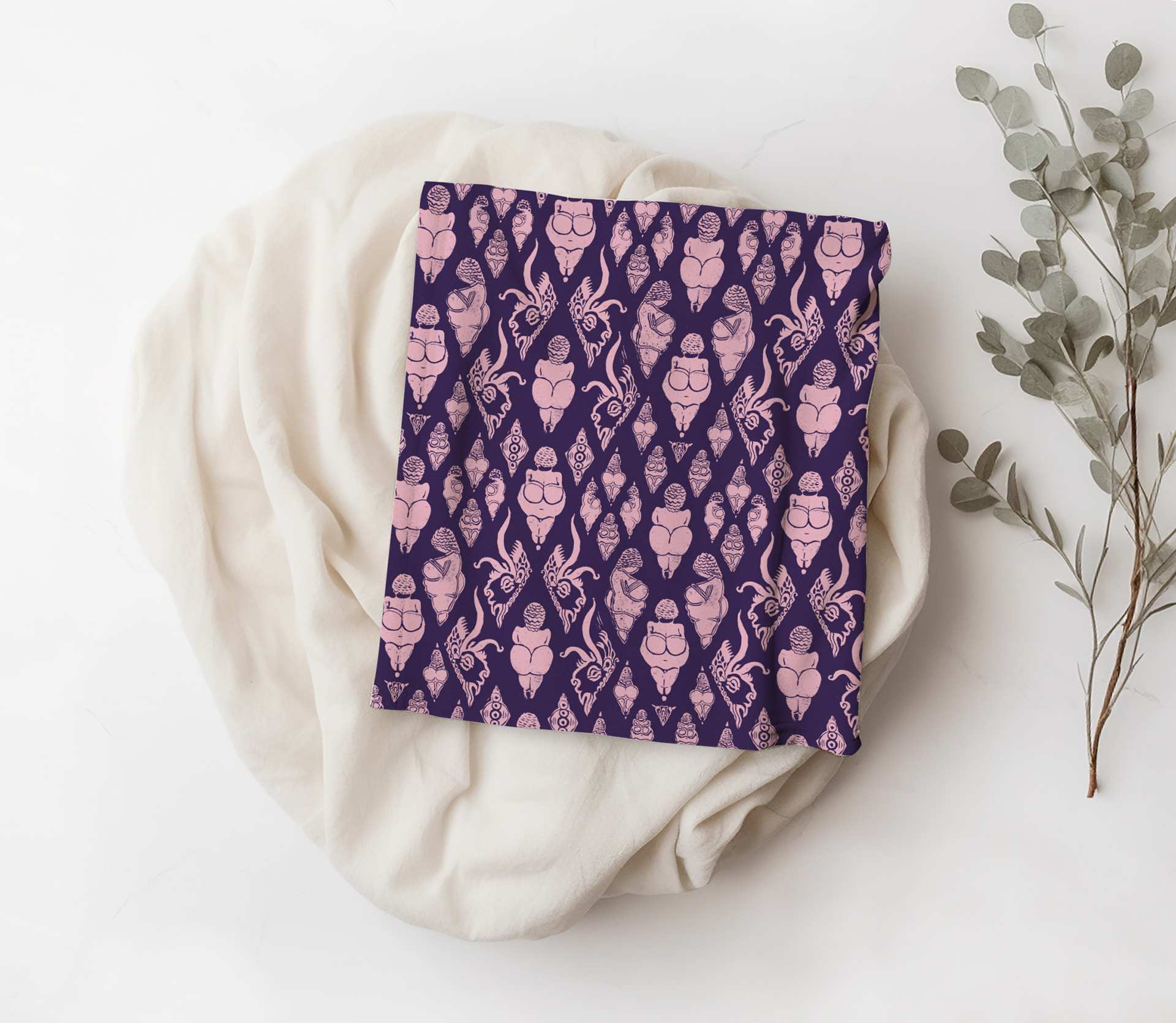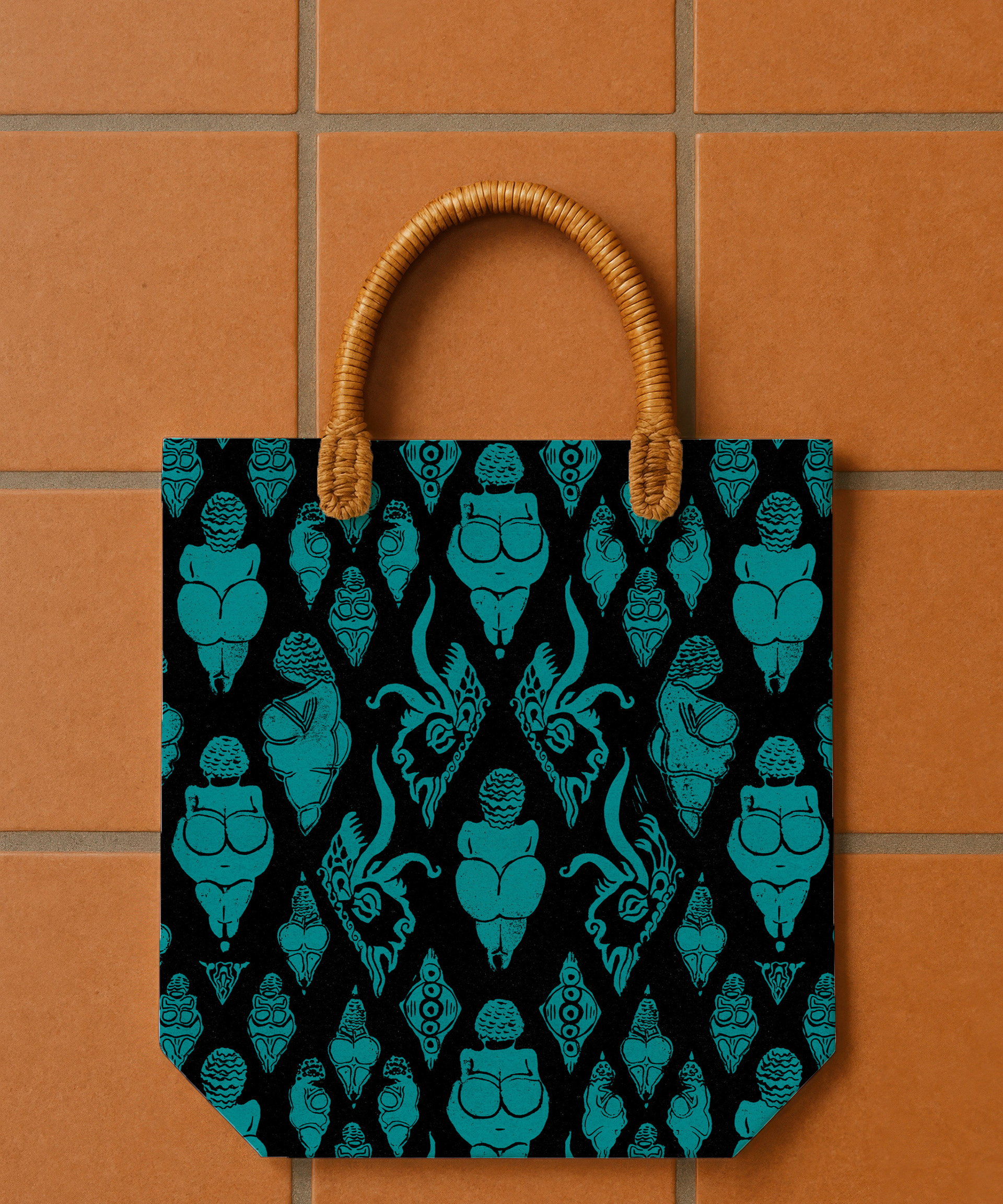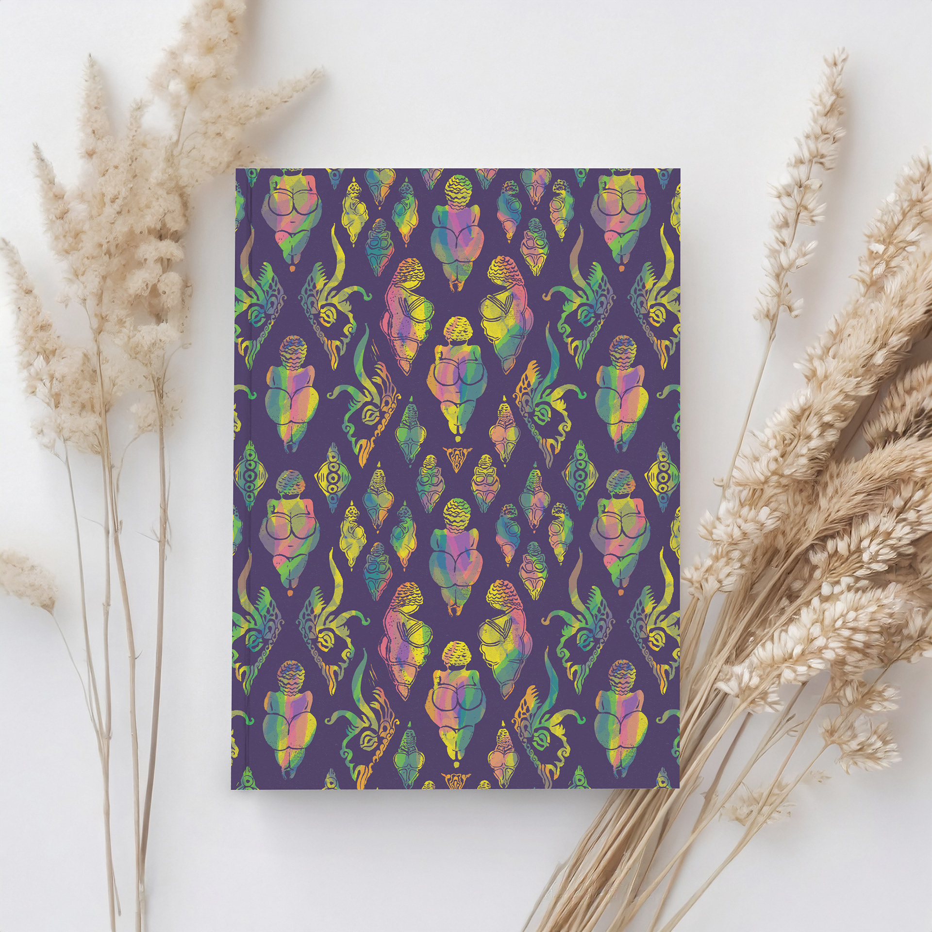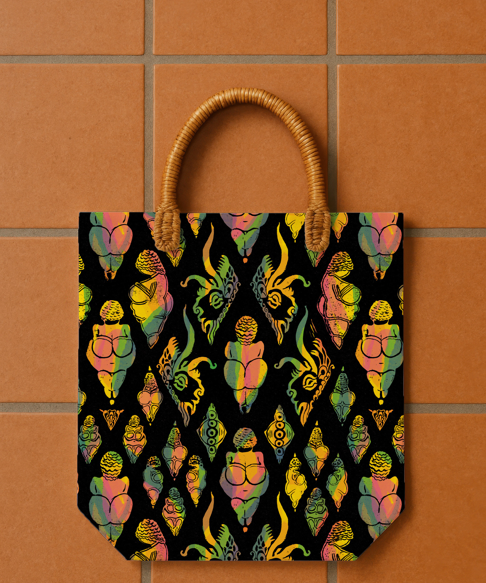 Venus of Willendorf print: An archeology, prehistoric goddess figurine inspired print pattern. Crafted as Blockprint, digitized and colored with Riso Print.