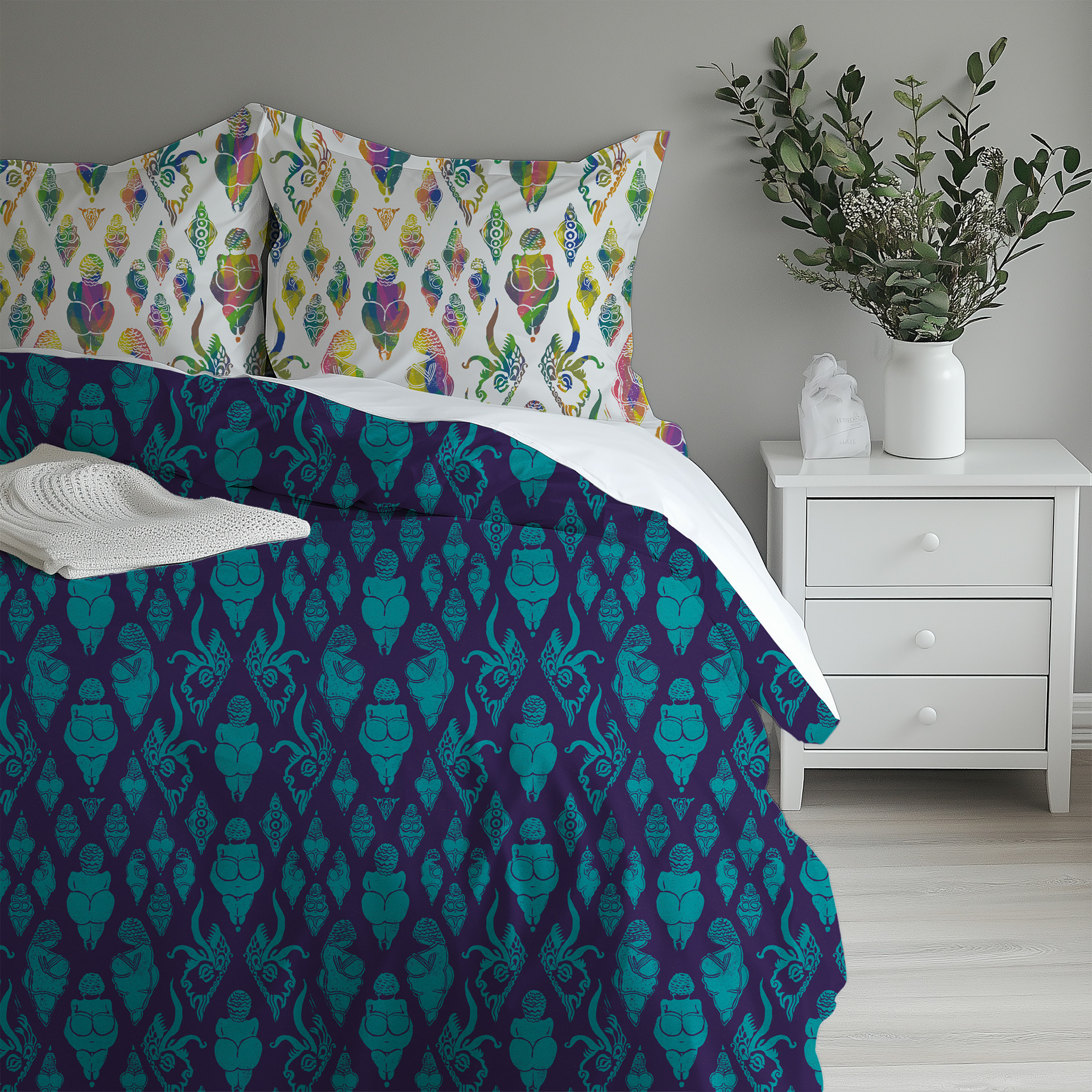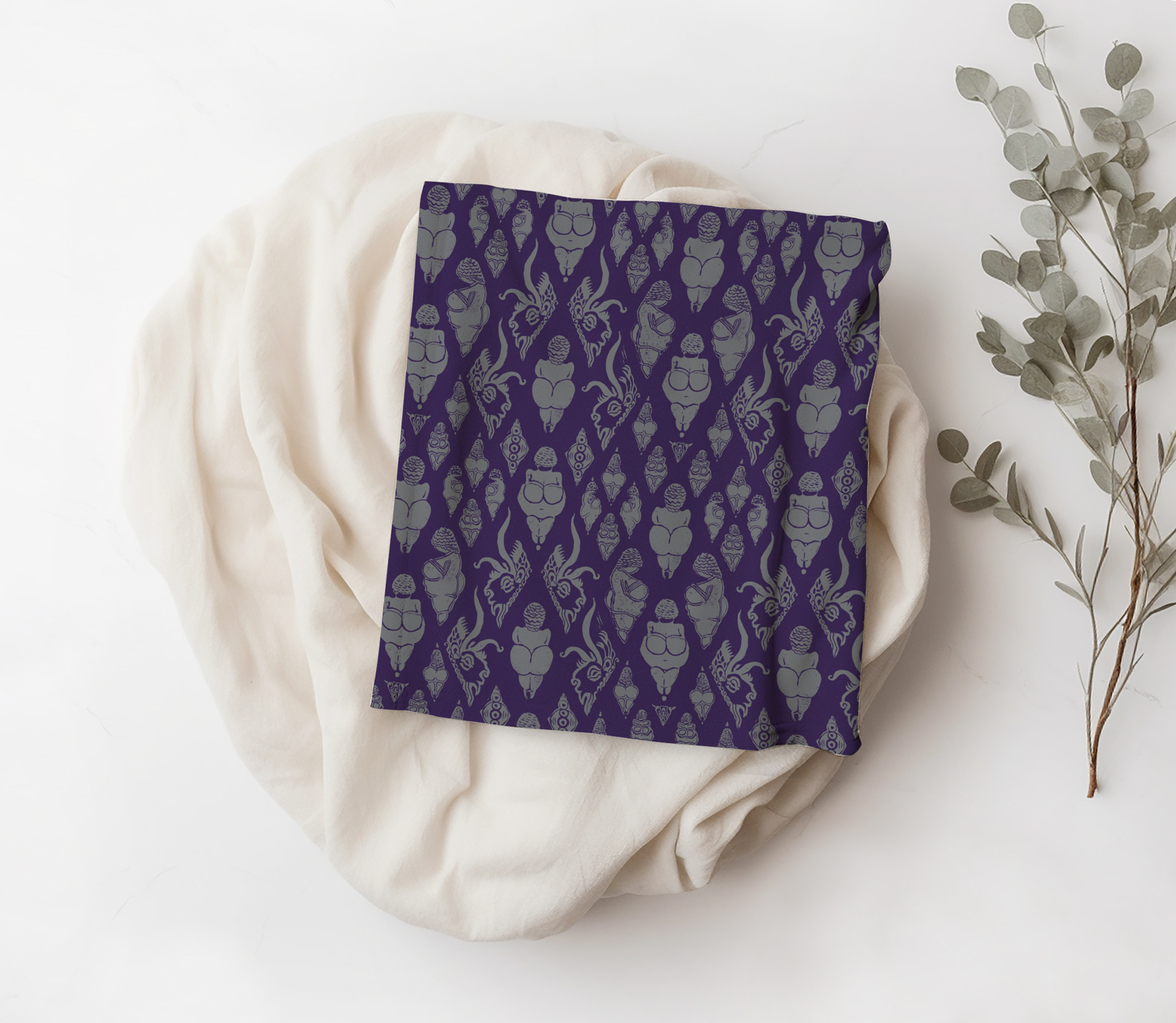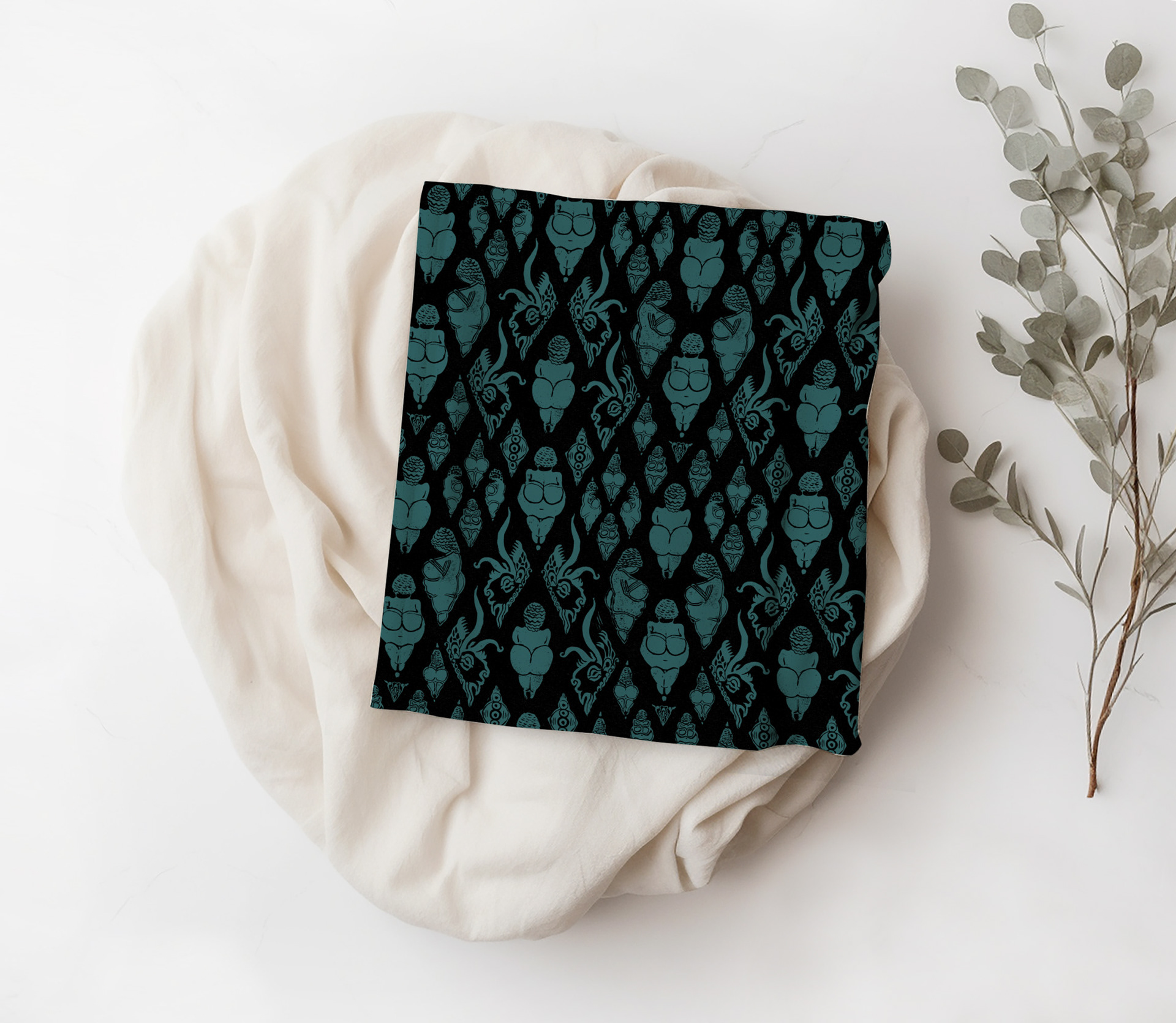 Venus of Willendorf print: An archeology, prehistoric goddess figurine inspired print pattern. Crafted as Blockprint, digitized and colored with Riso Print.
