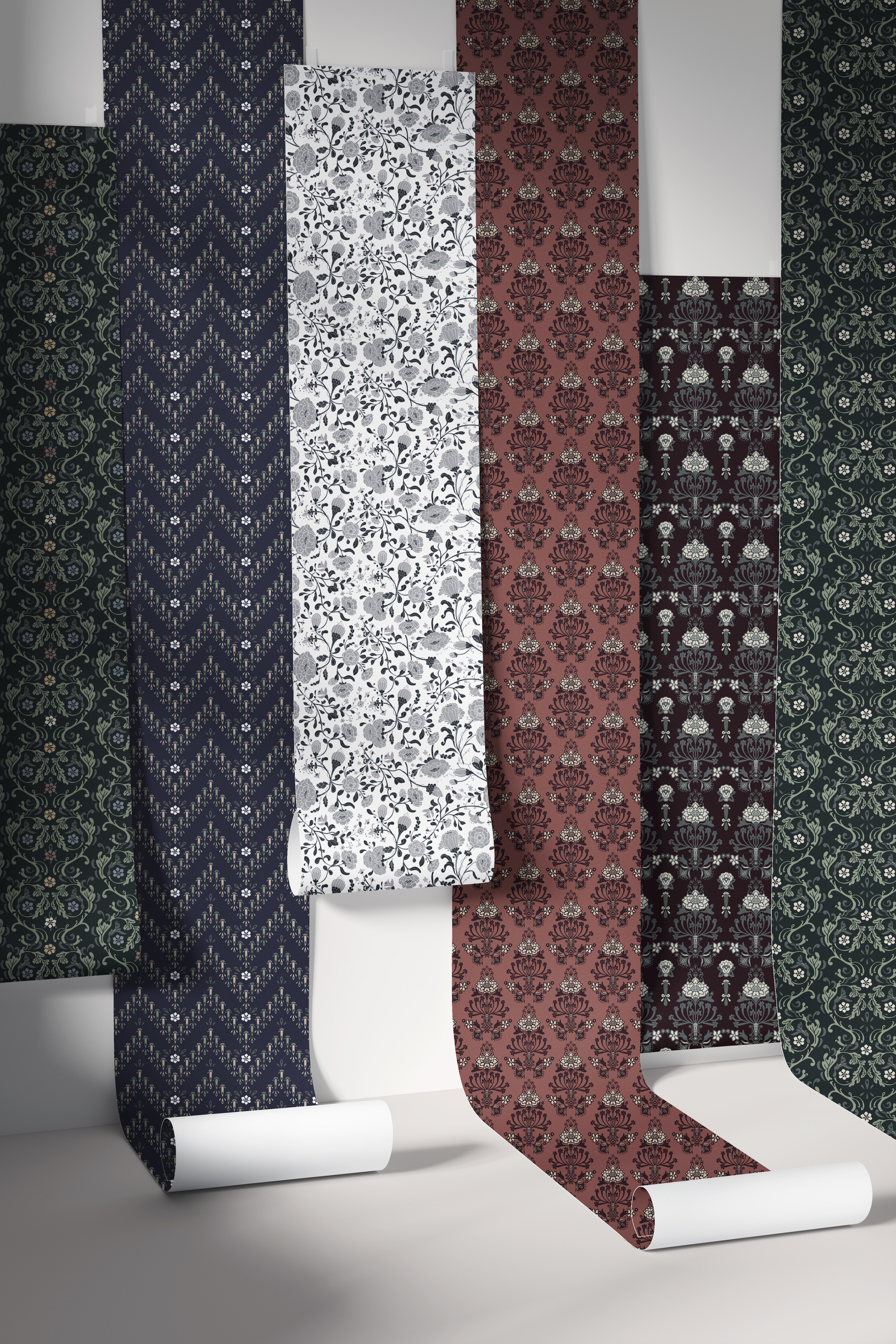 This collection combines dark moody backgrounds with detailed floral and botanical motifs, creating a classic and elegant look that works well in: