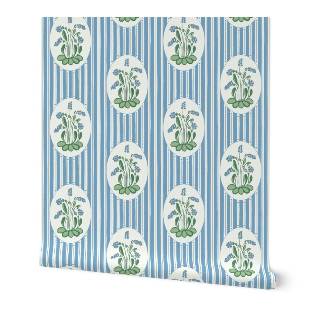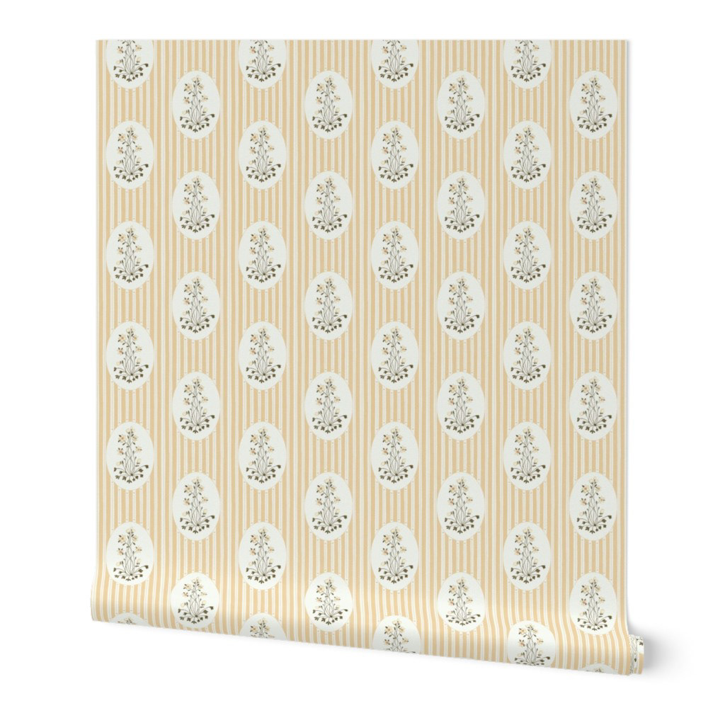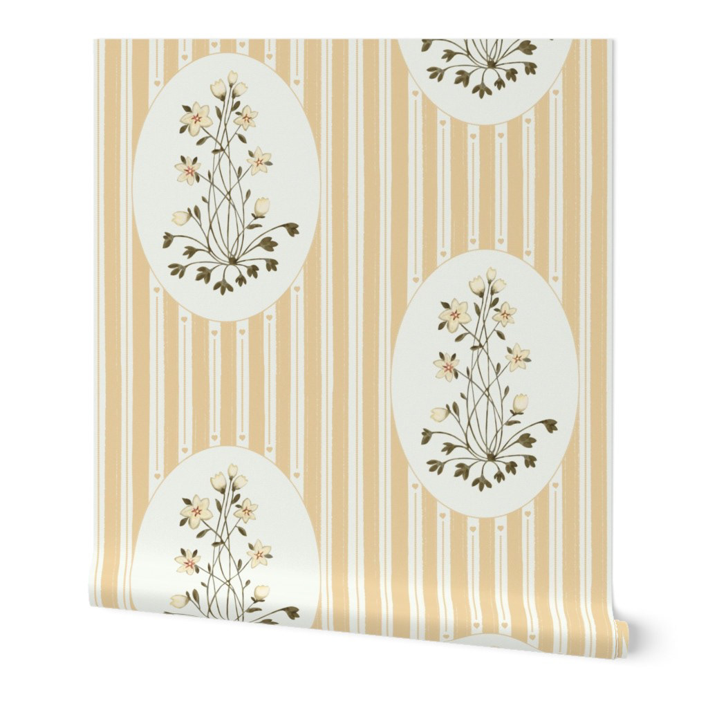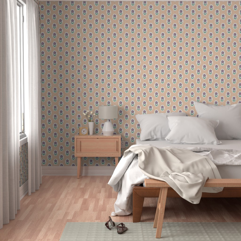 The designs in this collection are inspired by antique botanical prints and illustrated flower books, where individual flowers were carefully studied and drawn. These small floral motifs are arranged in repeating patterns, often combined with soft stripe backgrounds, creating a timeless and decorative look.