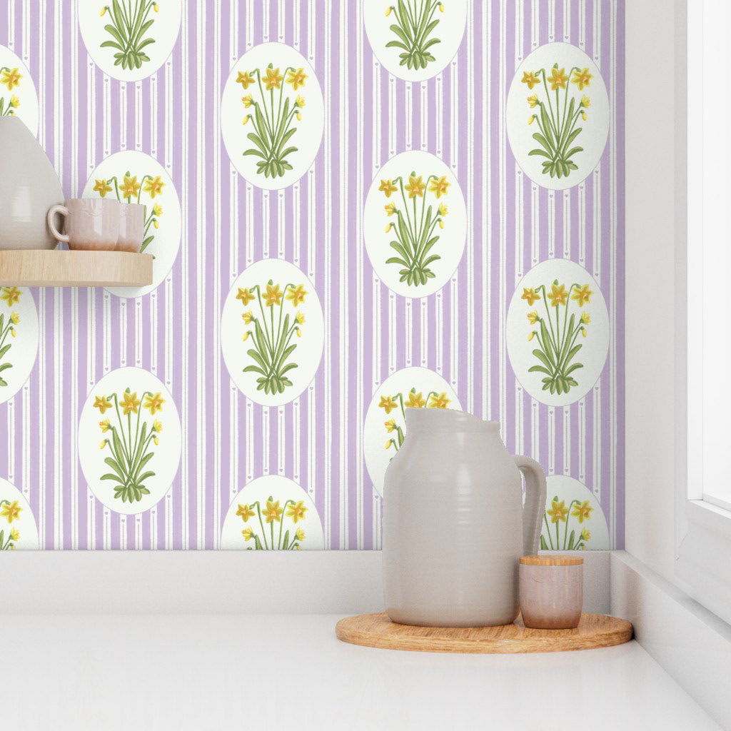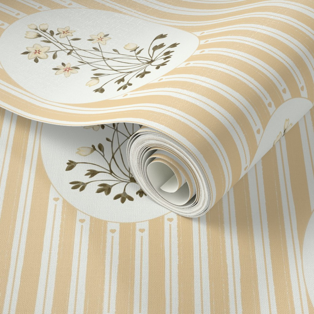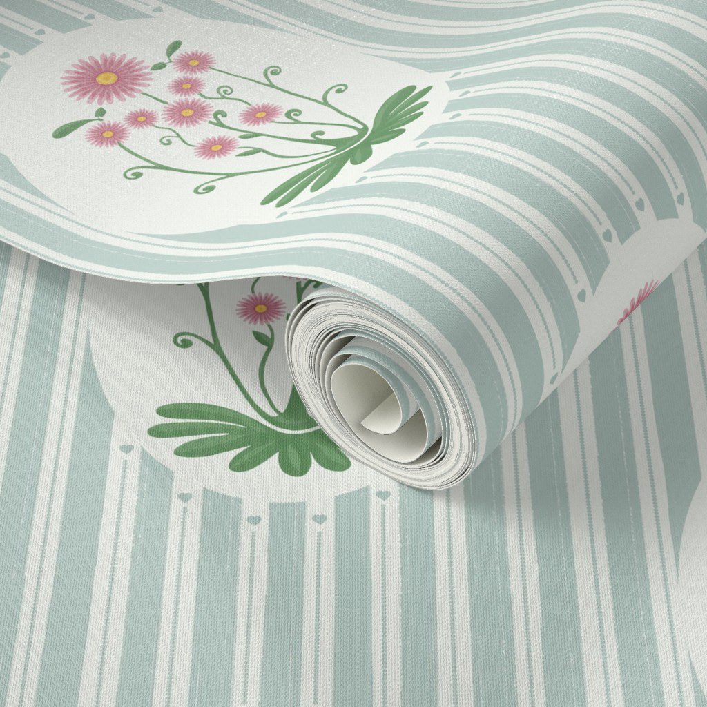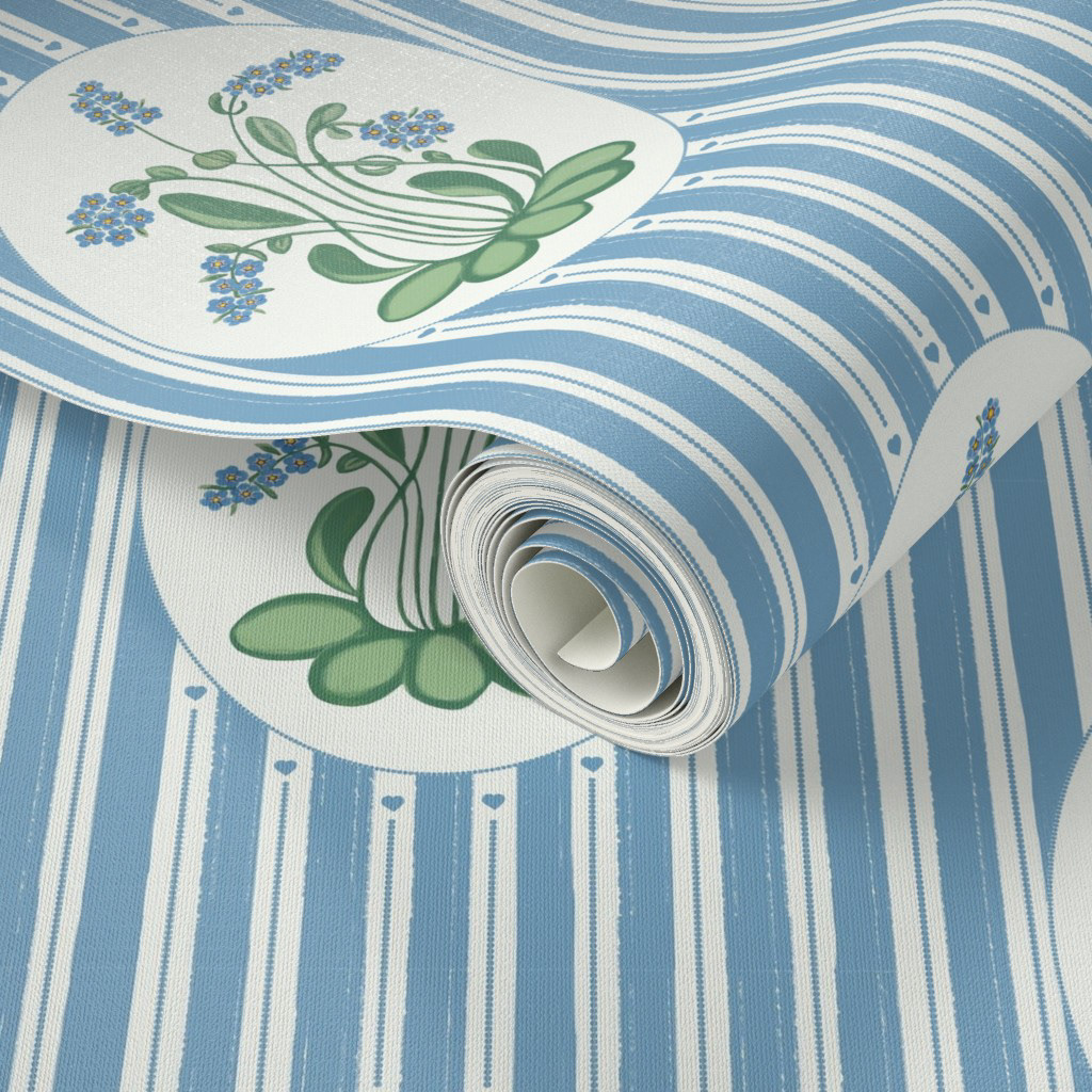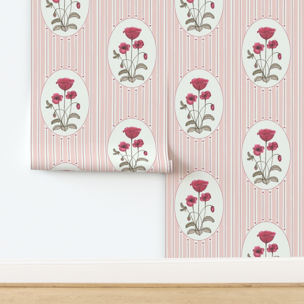 The designs in this collection are inspired by antique botanical prints and illustrated flower books, where individual flowers were carefully studied and drawn. These small floral motifs are arranged in repeating patterns, often combined with soft stripe backgrounds, creating a timeless and decorative look.