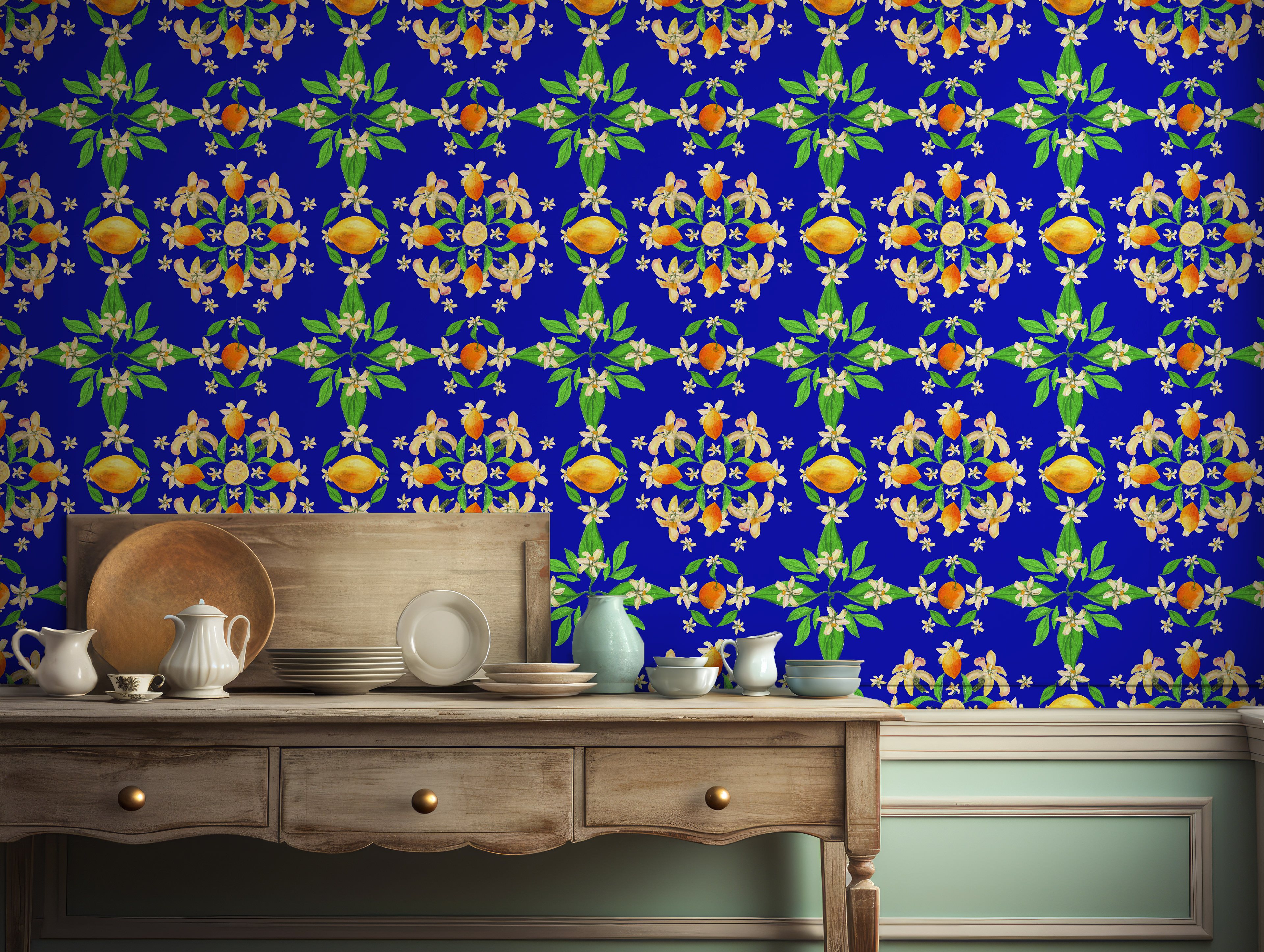 Ciao Capri: A vibrant hand painted wallpaper collection that burst of mediterranean sunlight; reflected in the ripe and lucious citrus fruits.