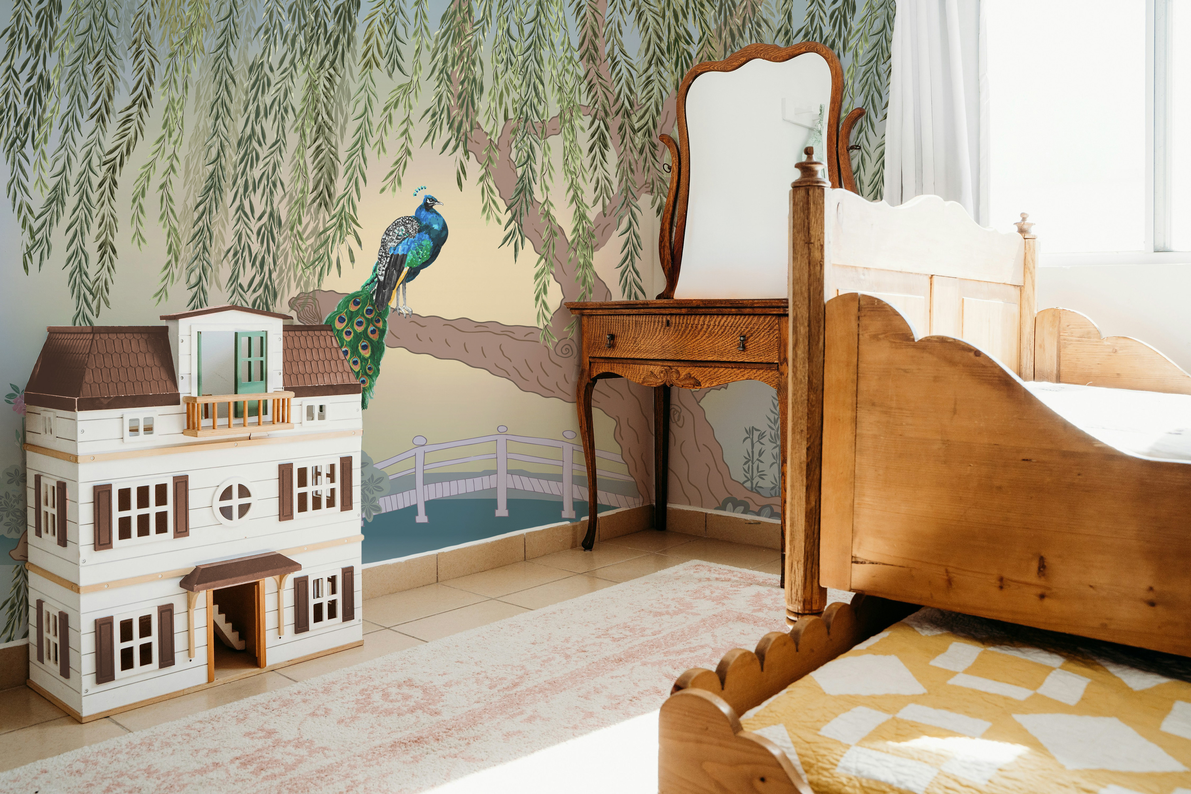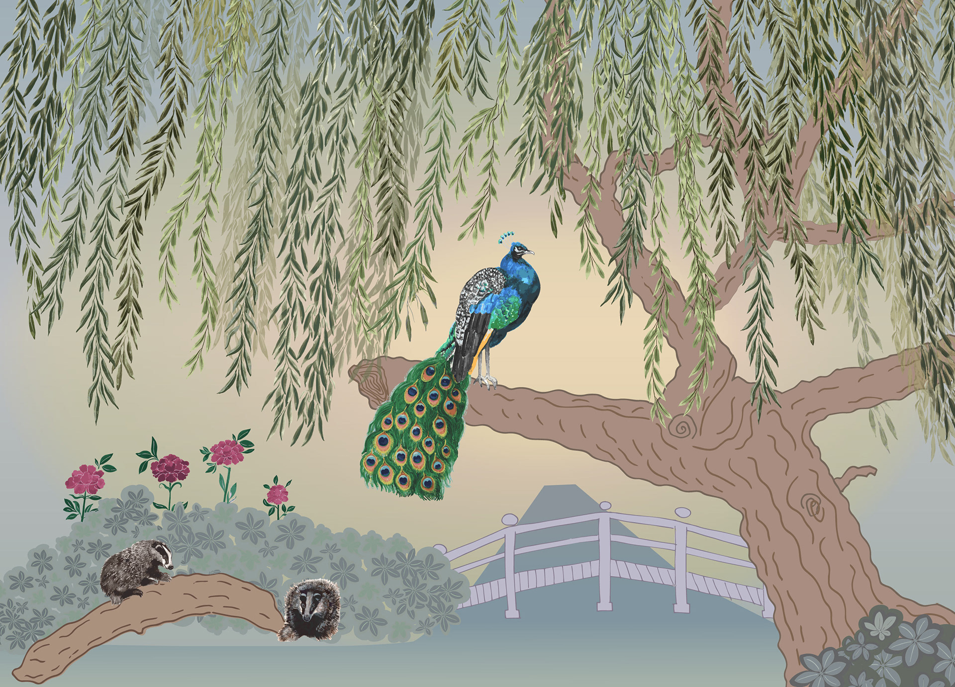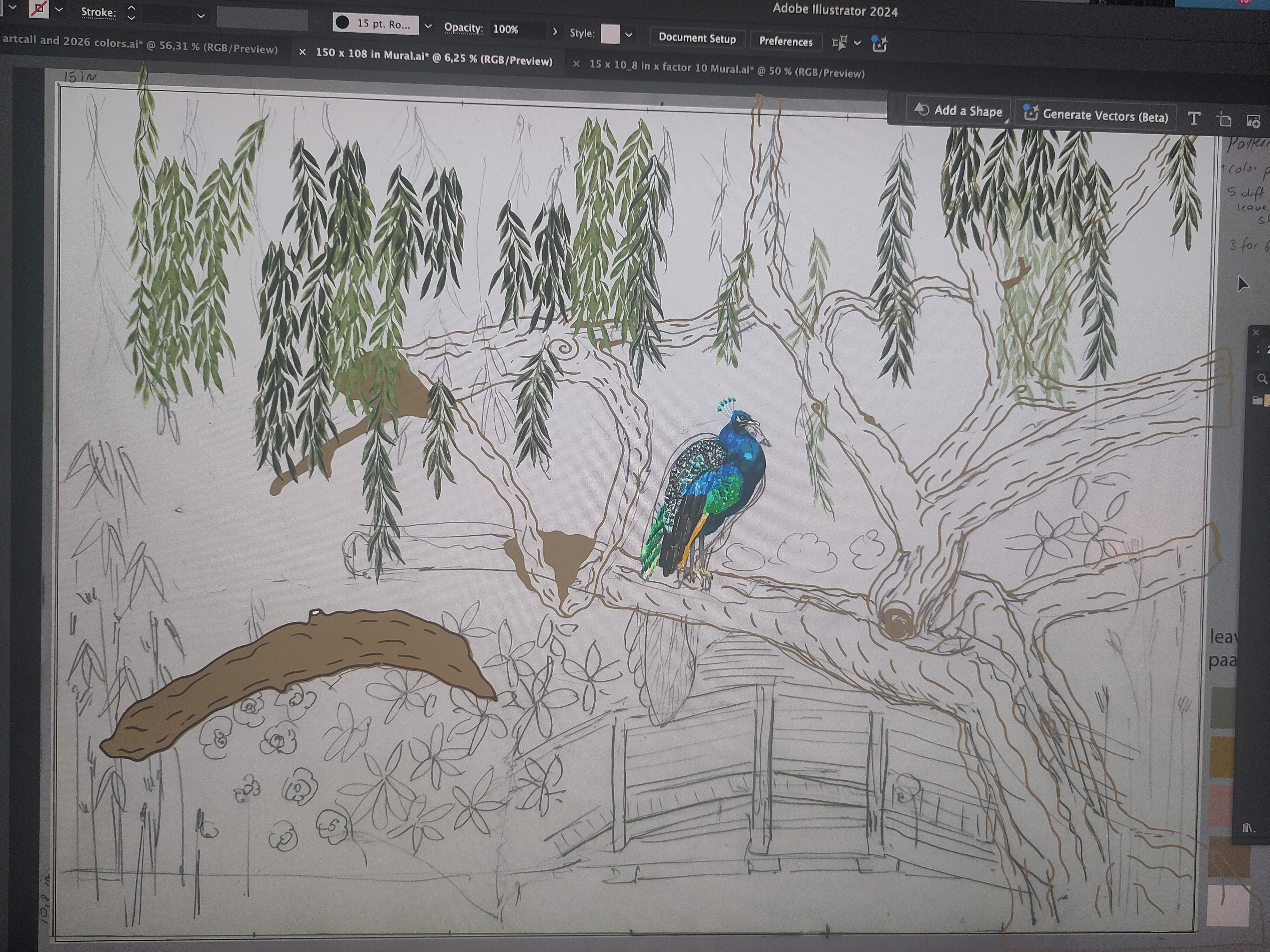 Wall Mural "Secret Sanctuary". Inspired by my onw photo's of an existing place near by. Hand painted with watercolor & gouache. Digitized, refined in Photoshop. Assembled in Illustrator. Designed for 150 in x 108 in. Currently under option for licensing.